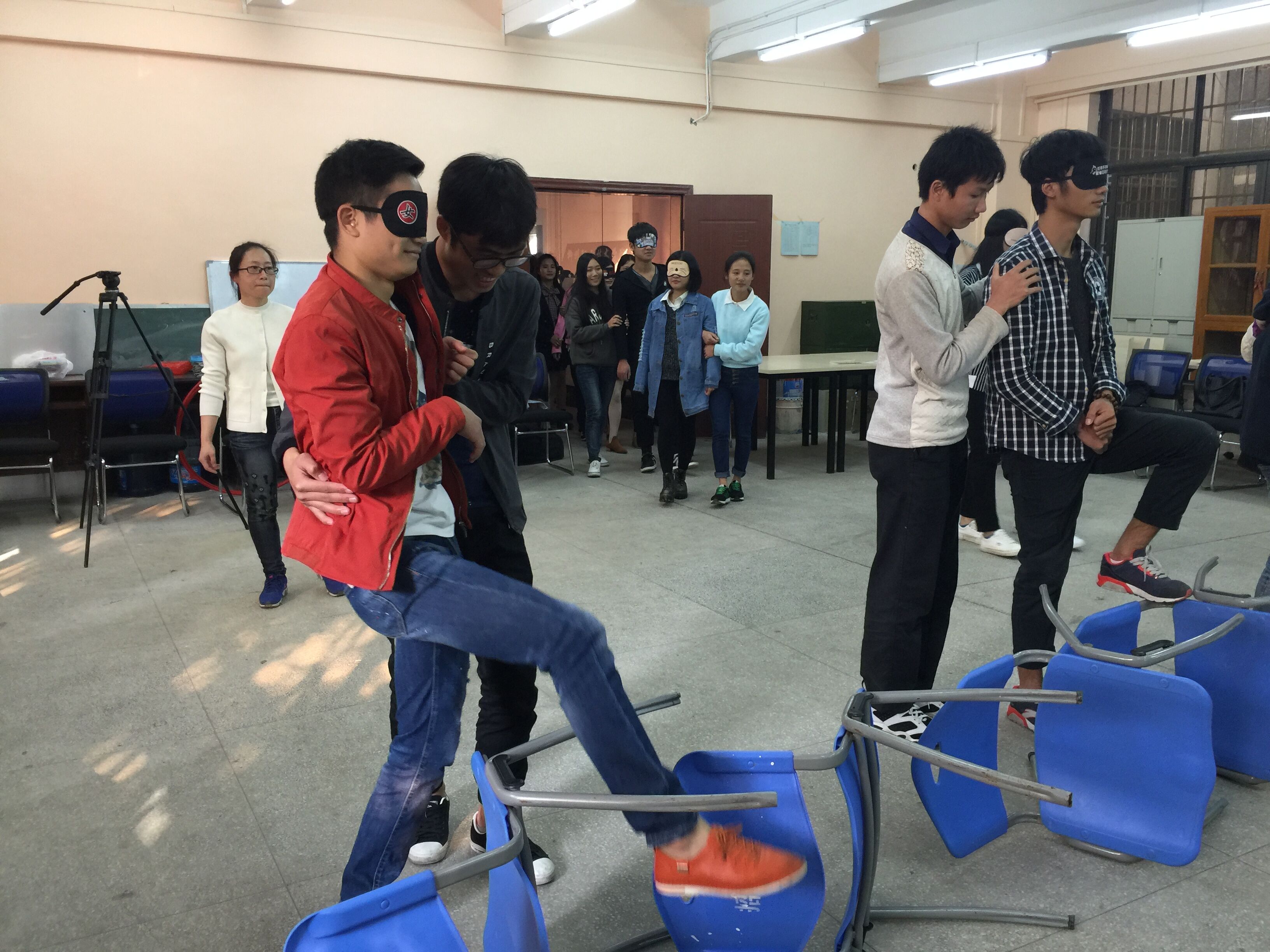 新闻网消息(文/艺术设计学院 覃晓晨、车孟霞 图/艺术设计学院 郑耀文)为响应习近平总书记在高校思想政治工作中以“立德树人为中心”,实现高校教育“全方位育人”事业的号召,提高学生干部的工作效率和责任感,12月9日,艺术设计学院在东校区学生活动中心开展了“信任.合作.责任--艺术设计学院学生干部团体心理拓展训练”?;疃牍不〔拷淌谧竽莺旌蜕缜г焊苯淌诶忌荷何迷悍滞盼岣刹孔雠嘌?。该院党总支书记王慧、学生科科长陈敏,分团委书记曾静、辅导员程志媛和覃晓晨以及来自该院的49名学生干部参加?;疃衫几苯淌谥鞒?。 左教授以《在一起,飞更高》的视频为序曲拉开了培训活动的序幕。该视频主要表现合作在团体中的力量,随后通过信任之旅、信任背摔、驿站传书三个互动环节,让学生干部体验信任的力量、勇于担当的责任感和严格的规矩意识?!靶湃伪乘ぁ被方诮雠嘌祷嵬葡蛄烁叱?,学生干部从一开始的“不相信,不敢倒”到“放开胆,试着倒”直至最后的“勇敢垂直倒下”,伴随着一声声坚定的呐喊,他们这一次次“背摔”不是轻易的摔倒,而是倾注了对同伴所有的信任。不少学生干部在培训会上分享道:“活动让我们很受触动,也让我们深刻体会到,只有依靠队友,才能走到最后”。 培训会尾声,分团委书记曾老师感谢两位教授到场培训,并总结了该院近期的工作,肯定了学生会开展的活动,表扬了学生干部积极工作的精神,同时对工作中存在的不足提出建议。