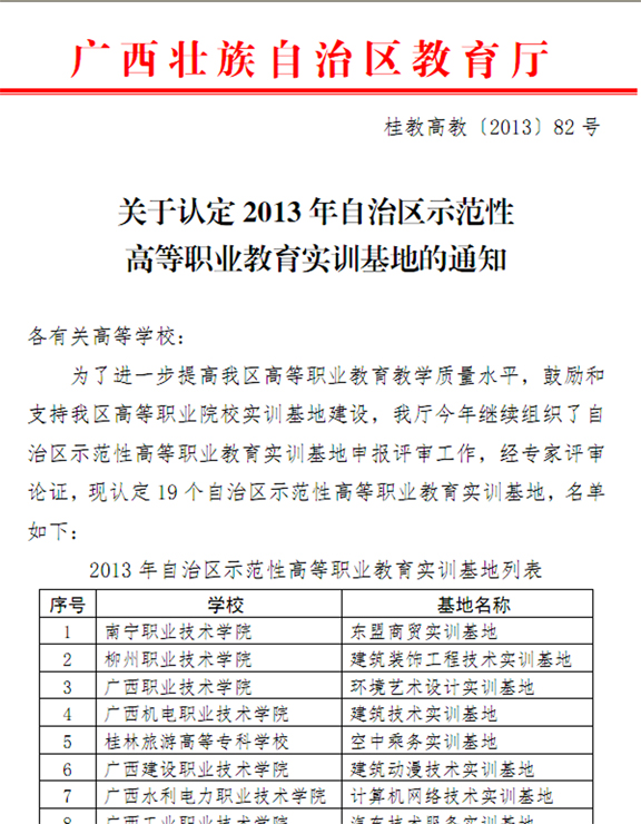 日前,由自治区教育厅下发的《关于认定2013年自治区示范性高等职业教育实训基地的通知》(桂教高教〔2013〕82号),公布了我院艺术设计系建筑装饰工程技术实训基地获批为区级示范性实训基地。 建筑装饰工程技术实训基地,依托建筑与环境艺术设计专业群,以自治区优质专业装潢艺术设计专业为龙头,开展建筑装饰工程类高职教育已经有15年的历史,毕业生就业率都在98%以上,深受用人单位好评。 近年来,该系把加强实训基地建设作为提升教学质量的关键,学院也给予了大力的支持,加大了经费的投入,使艺术系的实训基地形成了一定的规模。此次示范性高等职业教育实训基地成功获批,是对建筑装饰工程技术专业、装潢艺术设计专业办学质量的充分肯定,将有力促进两个专业的人才培养模式优化和课程教学改革的进一步深化。 (文、图/ 韦诗呐)近年来,该系把加强实训基地建设作为提升教学质量的关键,学院也给予了大力的支持,加大了经费的投入,使艺术系的实训基地形成了一定的规模。此次示范性高等职业教育实训基地成功获批,是对建筑装饰工程技术专业、装潢艺术设计专业办学质量的充分肯定,将有力促进两个专业的人才培养模式优化和课程教学改革的进一步深化。 (文、图/ 韦诗呐)
