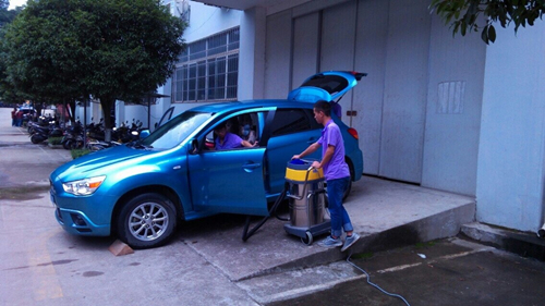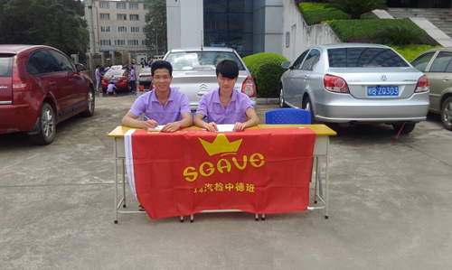 由于提前通过邮件和短信对此次活动进行了宣传,活动一开始就有不少车辆停在竞泽楼前等待清洗?;疃殖。栌凶诺慕哟ê图蛞椎墓丝托菹⑶?,活动分别设置了两个场地,可同时为四辆汽车清洁。本次活动负责人、14级中德班班长梁宽同学介绍,洗车标准严格参照汽车美容中心的程序来操作,洗车前先让车主填写车辆的相关信息,然后对车辆的车身外观、两油一液等情况进行检查,并及时记录下车辆的异常情况。洗车过程中,至少需要经过6道工序,首先,用清水将车身清洗一遍;第二,给车身上涂抹上洗车专用的洗车液,静置过几分钟后再用水冲洗干净;第三,用大毛巾把水擦干;第四,用小毛巾仔细地把边边角角残留的污垢擦干净;第五,吸尘和清洗车内的脚垫、坐椅;第六,擦拭车内的仪表盘、车窗玻璃等。洗车后,还让车主对车辆清洗情况和学生在洗车过程中的职业素养进行评价。
