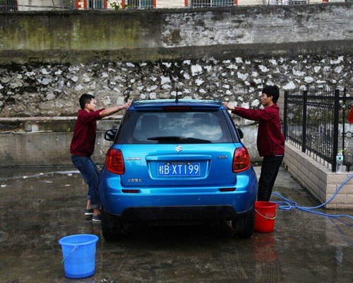这已经是该班第三次举行义务清洗和维护保养汽车活动了,学生们对清洗、保养汽车的方法和操作流程都已经驾轻路熟,他们早早就来到竞择楼前为活动分组、准备工具,以最饱满的热情等候老师们的到来。