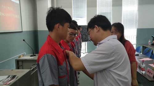 学院领导和专业老师们为2016级中德班所有同学佩戴上象征着荣誉和骄傲的名牌。从此,“SGAVE”的字样与这30名同学的姓名紧密联系在一起。这不仅是荣誉,更承载着责任和期盼。