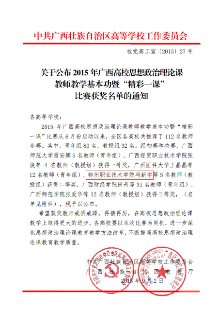 新闻网消息(通讯员/公共基础部 黄志卫)近日,从《关于2015年广西高校思想政治理论课教师教学基本功暨“精彩一课”比赛决赛有关事宜的通知》(桂教办〔2015〕436号)获悉,我院思政部冯新宇老师在2015年广西高校思想政治理论课教师教学基本功暨“精彩一课”决赛中荣获二等奖。