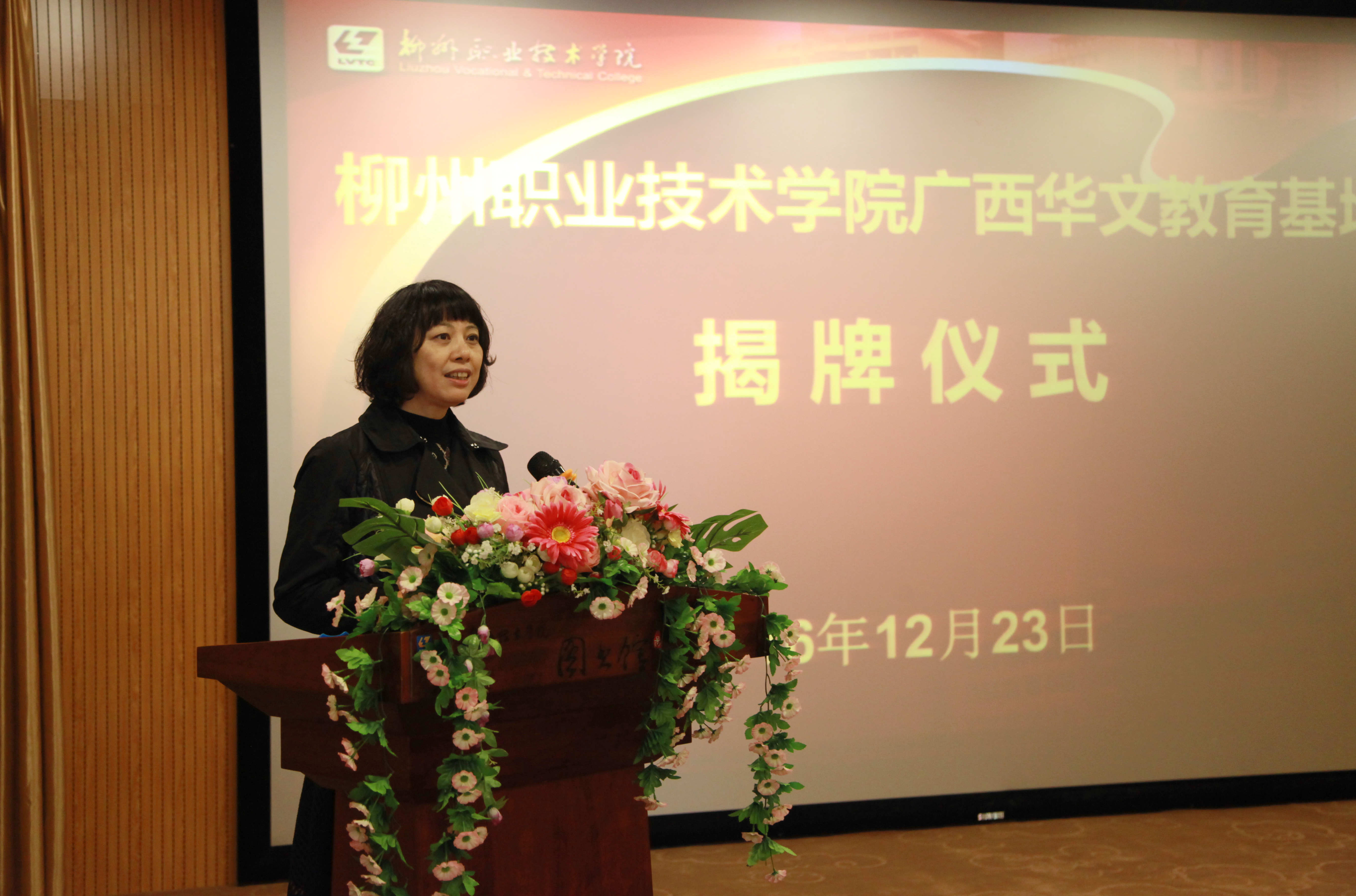 自治区侨务办公室文化教育宣传处处长史荣平致词,对我校成为柳州一个新的华文教育基地表示祝贺。史处长说,华文教育工作是侨务工作一项具有战略意义的基础性工作,是面向海外华侨华人特别是华裔青少年开展民族语言教育和中华文化传承的工作,它在传播中华文化,促进中外交流,涵养侨务资源,推动中华文化走向世界、增强中华文化的影响力等方面具有重要意义。史处长希望未来政府和院校两方面形成合力,借助柳职院的师资和办学优势,与海外需求进一步有效对接,积极开展丰富多彩的华文教育活动,组织各项对外合作交流和教育培训项目,共同做好海外华文教育工作。