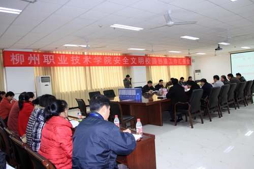 专家组由广西师范学院党委副书记傅真放、广西工业职业技术学院副院长罗英极、广西师范学院保卫处处长谢宝健、广西民族大学宣传部部长陈积光、广西经贸职业技术学院学工处副处长彭德山组成。我院党委书记朱伟才,副书记阳旭,副院长杨毅,院长助理李彰汉,保卫处处长莫帮雄,宣传部部长左妮红,学生工作处处长梁毅,后勤与资产管理处处长黄志强出席汇报会。学院保卫处、后勤外、团委、财务和各系部分管安全文明校园创建工作的领导也参加了本次会议。