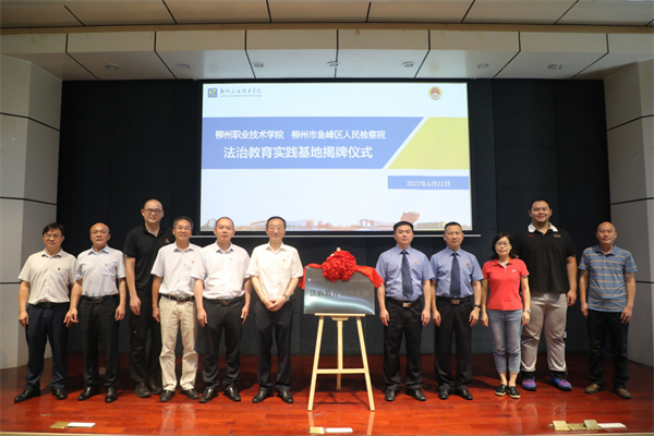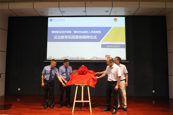 仪式上,柳州市人民检察院党组副书记、副检察长吴虹,柳州市鱼峰区人民检察院党组书记、检察长梁韬,校党委副书记、校长甘金明,校党委副书记阳旭共同为法治教育实践基地揭牌。